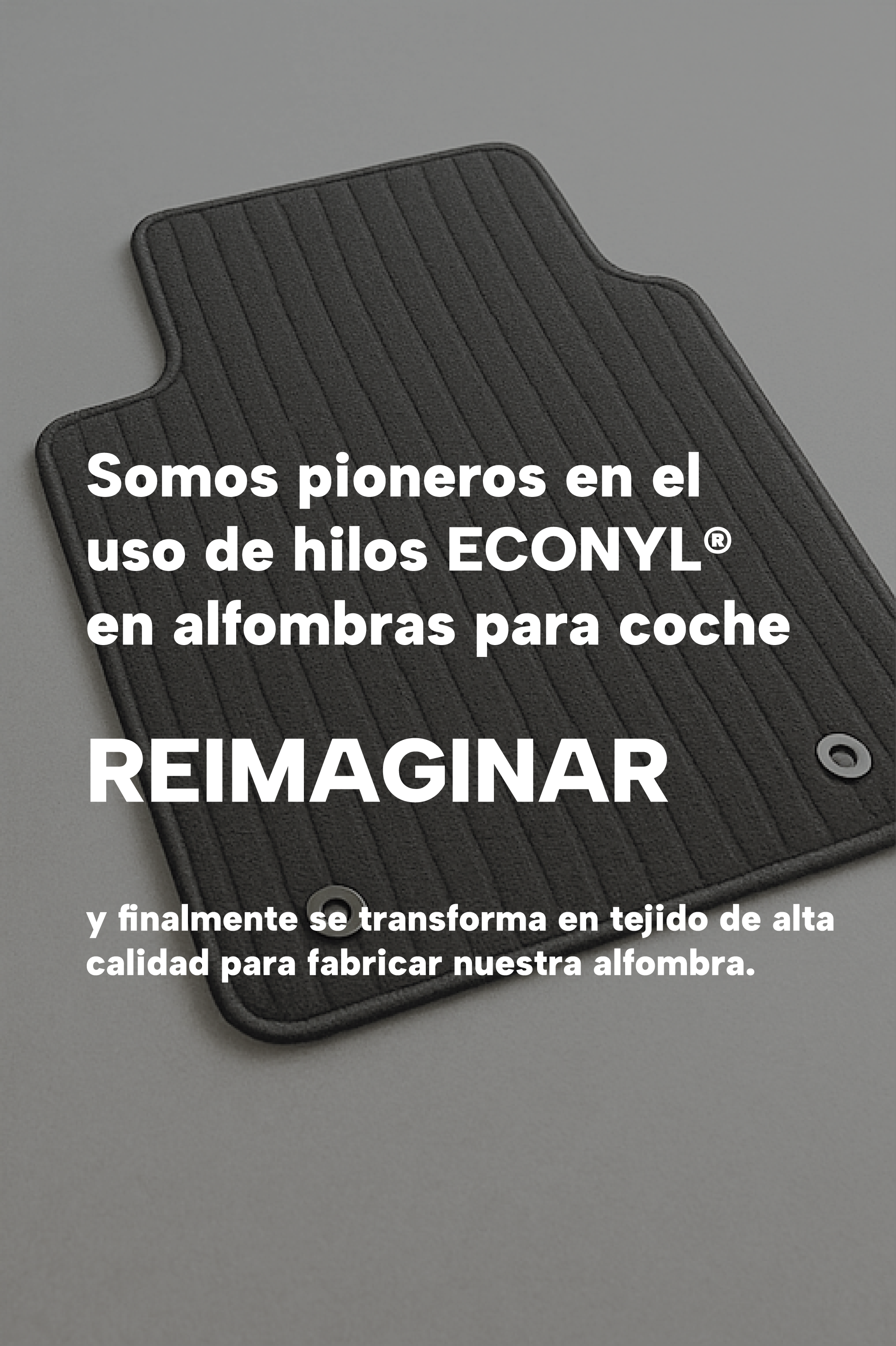 Entre nuestras soluciones sostenibles destaca el uso de ECONYL®, un hilo de nylon 100% regenerado a partir de residuos marinos y de vertederos, como redes de pesca, alfombras viejas y restos textiles industriales. Este material no solo iguala en calidad y resistencia al nylon virgen, sino que también contribuye a cerrar el ciclo de los desechos, dándoles una nueva vida en forma de alfombras y accesorios para vehículos que cuidan del medio ambiente sin sacrificar el diseño ni la durabilidad.